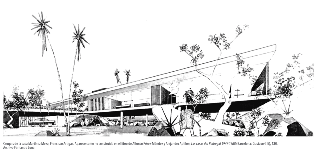 La residencia, conformada por dos niveles, que ocupa casi 500 m2 de des-plante en 4 000 m2 del terreno, fue proyectada y construida a mediados de la década de los años cincuenta por el arquitecto Francisco Artigas, a petición del ingeniero Martínez Mesa, quien murió antes de que fuera concluida, por lo que la construcción se suspendió. Por esta situación se creyó que el proyecto nunca había sido construido, según la leyenda del croquis publicado el libro Las Casas del Pedregal 1947-1968. Fue puesta en venta por la esposa de Martínez Mesa, quien vendió el inmueble a la constructora que se encargó de concluir el proyecto, hasta que llegó a habitarla Fernando Bustamante Aguirre, quien vivió cerca de cinco años con su familia en Guadalajara por motivos de trabajo, pero al concluir sus proyectos laborales, en 1958, se mudó a la Ciudad de México. Desde su llegada, se dedicó a buscar una propiedad en el Pedregal hasta que encontró este inmueble, el cual cumplió con sus expectativas espaciales y estéticas, por lo que decidió adquirirlo en 1959 para mudarse con su esposa y sus cuatro hijos, entre ellos Roberto y su hermana María Eugenia Bustamante Castrejón, actuales propietarios de la casa.