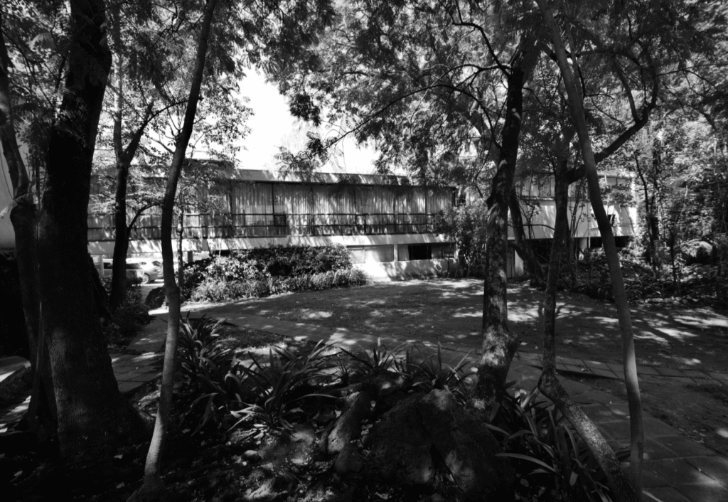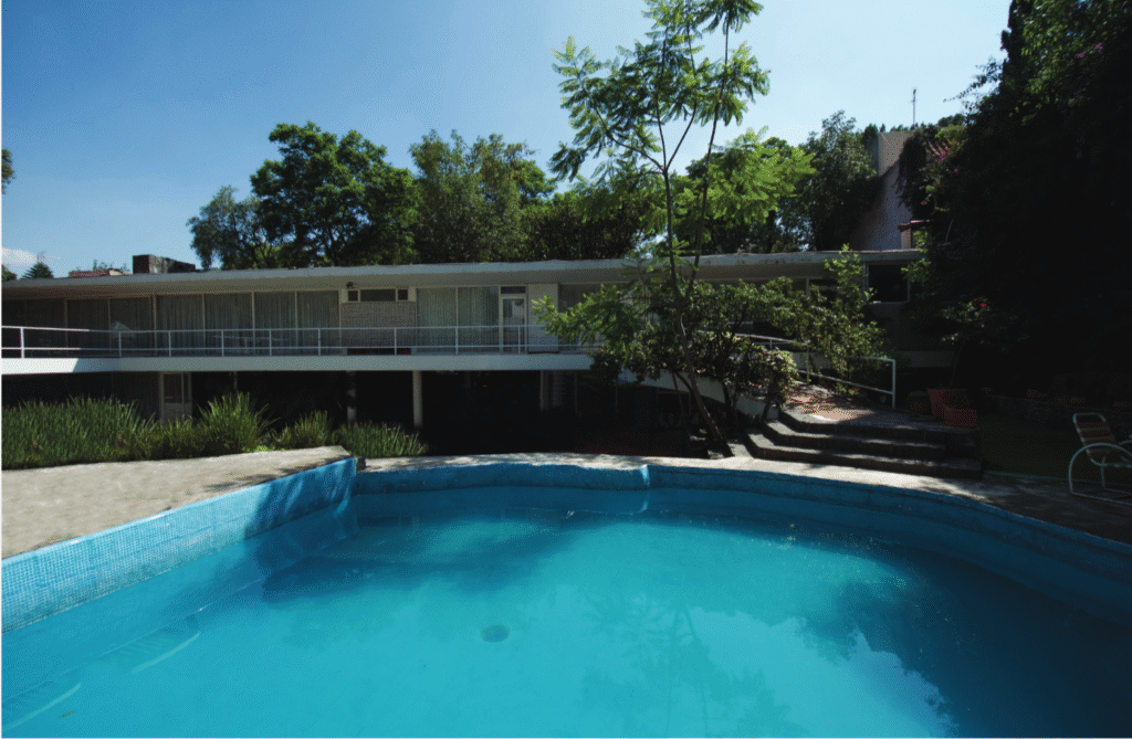 El edificio principal tuvo una presencia protagónica desde cualquier parte del predio, principalmente desde el acceso, ya que desde éste se comienza a descender casi tres metros hasta llegar a la casa. El edificio con su desplante elevado, sostenido principalmente por columnas, lograba resaltar su fachada, que por décadas sirvió como fondo principal del paisaje en el terreno. Actualmente dicho protagonismo en el acceso de la propiedad ha sido suprimido por la presencia de la última casa construida después del año 2000, ubicada en el extremo suroeste —junto al acceso peatonal—, al igual que la cubierta desmontable de una terraza, ambas emplazadas en lo que alguna vez fue parte de la piscina original y área del jardín.