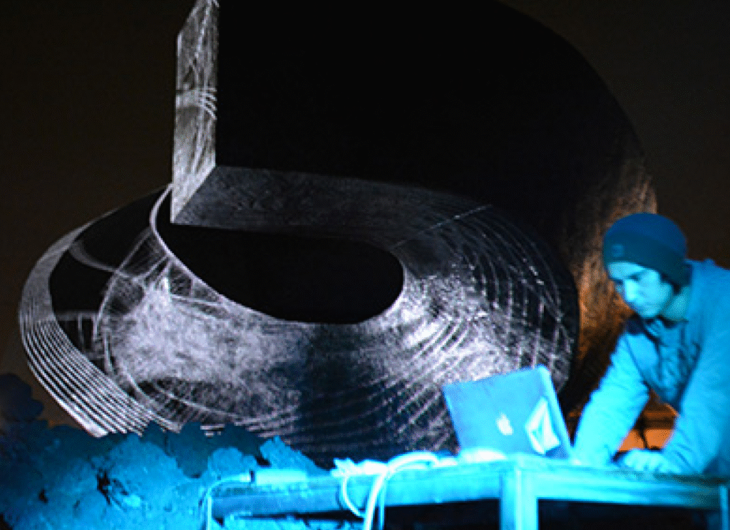 El mapping sobre la escultura de Australia se inspira en las líneas que conforman logotipo México 68 y trazos Huicholes para envolverla desde el tiro de cinco proyectores que envolvían de imágenes la escultura.